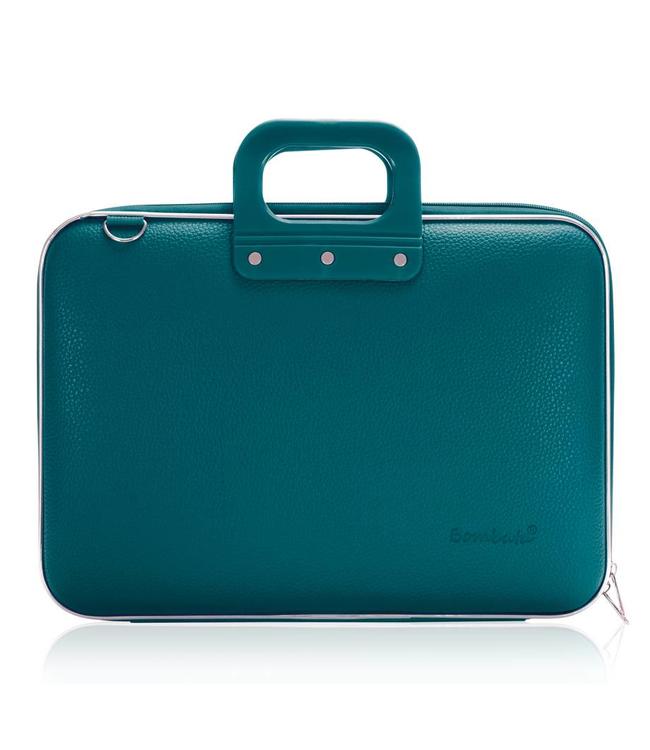 Deze stevige groenblauwe laptoptas is gemaakt van stevig kunstleder met siliconen handgrepen en is geschikt voor laptops van 15 / 15.6 of 16 inch. De Bombata laptoptassen zijn alles behalve saai en worden gemaakt in verschillende kleuren. Om de randen van de tas zit een stijlvolle chromen bies. De laptoptas is gemaakt uit degelijke materialen en is voorzien van een afneembare en verstelbare schouderband.